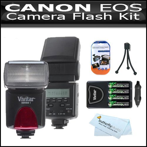 Kit Includes:♦ 1) Vivitar - Vivitar DF-293 TTL LCD Bounce Zoom Swivel DSLR AF Flash (For Canon)♦ 2) Zeikos - Deluxe Universal 5" LCD Screen Protectors ♦ 3) Sakar - Mini Tripod♦ 4) ButterflyPhoto - ButterflyPhoto Micro Fiber Cleaning Cloth♦ 5) Vivitar - 4 AA High Capacity NIMH Rechargeable Batteries & Rapid A/c D/c Charger